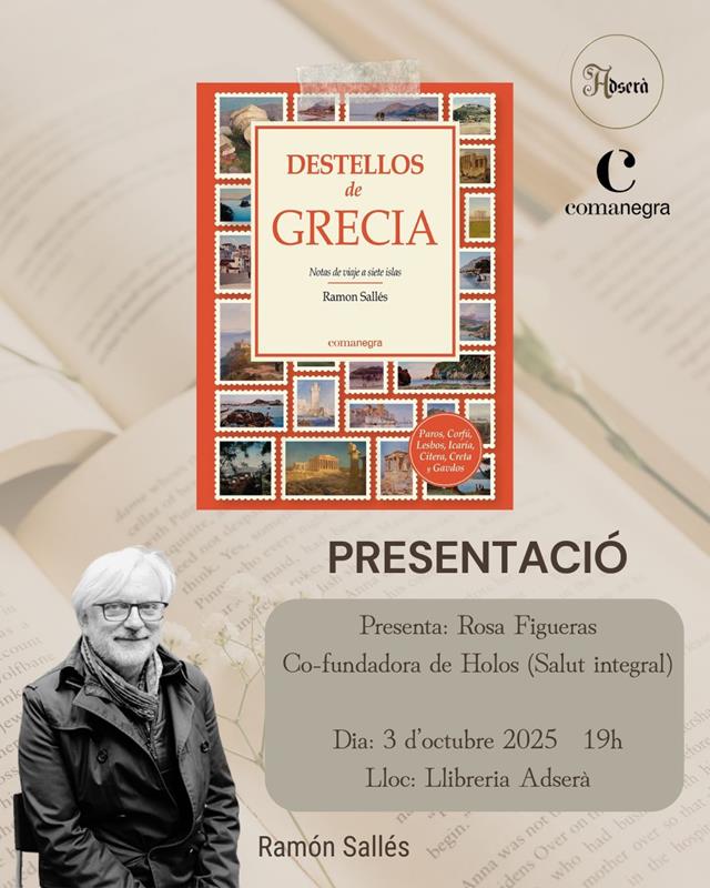 Presentació: Destellos de Grecia de Ramón Sallés Ed. ComanegraPresenta: Rosa Figueras Co-fundadora de Holos (Salut integral)Dia: 3 d’octubre 2025Hora: 19hLloc: Llibreria Adserà