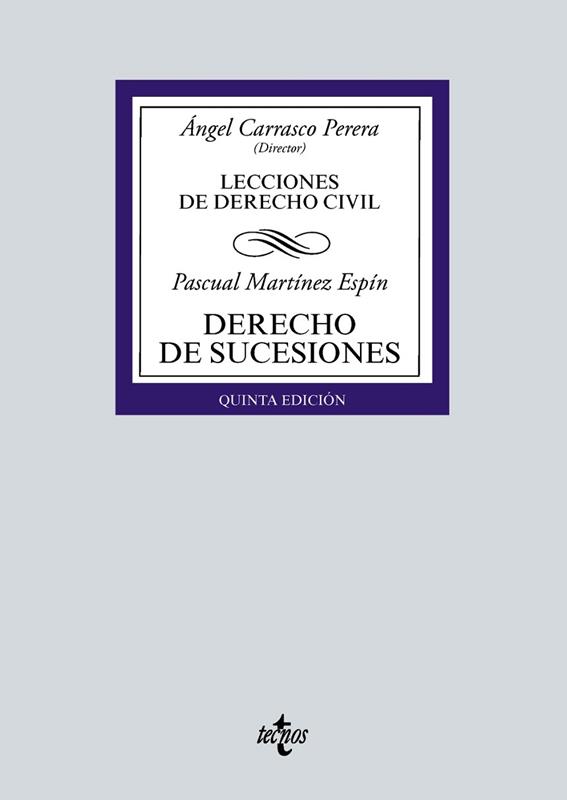 El Derecho de Sucesiones escrito por el Catedrático Martínez Espín pretende ser un texto de referencia tanto para estudiantes de Grado en Derecho y Doble Grado (Derecho y otras titulaciones), como para profesionales -sean jurídicos o no-. Esta obra tiene por objeto ofrecer una visión completa, didáctica y actual sobre los aspectos esenciales del Derecho de Sucesiones. La obra no se limita ser manual al uso, sino que pretende contar de una manera sistemática los contenidos básicos de la sucesión mortis causa. Para lograr este objetivo, se han utilizado técnicas diferentes. En primer lugar, se reduce en la medida de lo posible la glosa de normas jurídicas en el cuerpo de texto de enseñanza, gracias a los cuadros que preceden al desarrollo de cada epígrafe. En segundo lugar, se atiende a lo esencial, sin disquisiciones doctrinales o jurisprudenciales. En tercer lugar, cada epígrafe está compuesto por varios párrafos con un título que sintetiza la idea central, con la finalidad de que el lector distinga los contenidos de cada pregunta. En cuarto lugar, las cuestiones más relevantes se contienen en esquemas. Por último, en un cuadro final se sintetizan los conceptos y reglas jurídicas más significativas de cada lección.