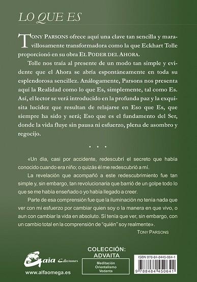 Tolle nos traía al presente de un modo tan simple y evidente que el Ahora se abría espontáneamente en toda su esplendorosa sencillez. Análogamente, Parsons nos presenta aquí la Realidad como lo que Es, simplemente, tal como Es.